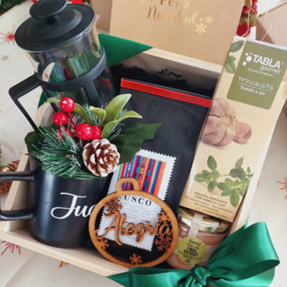Caja de pino decorada 25*25cm 01 Prensa Francesa 350cc 01Café molido Cusco 250gr 01 taza personalizada en vinil 01 Tabla Gourmet Pitacrips 100gr 01 Paté a la finas hierbas Coren 160gr Tarjeta Navideña con dedicatoria